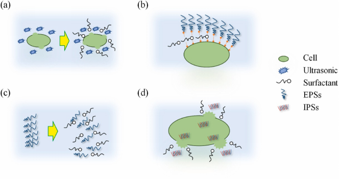 圖3 表面活性劑強(qiáng)化超聲波法提取的四種機(jī)理。(a)降低表面張力;(b)破壞EPSs與細(xì)胞體間的非共價(jià)鍵;(c)相似相溶作用;(d)破壞細(xì)胞壁或細(xì)胞膜結(jié)構(gòu)(來(lái)自原文)