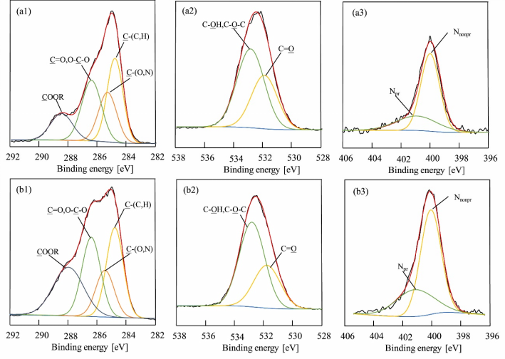 圖6 高分辨率XPS圖。C 1s (a1、b1)、O 1s (a2、b2)和N 1s (a3、b3),PSus(a1~a3)和PSu(b1~b3)(來(lái)自原文)
