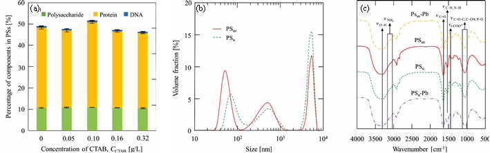 圖4 高分子物質(zhì)的特性分析。(a)多糖、蛋白質(zhì)和DNA的質(zhì)量百分比;(b)PSus和PSu的典型粒度分布;(c)各PSs的FTIR(來(lái)自原文)