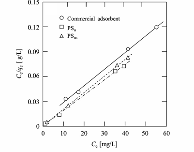 圖7 PSu、PSus和商用吸附劑對(duì)Pb2+的Langmuir吸附等溫線(吸附劑的濃度為60 mg·L-1,Pb2+的初始濃度為0.1~0.6 mmol·L-1,實(shí)驗(yàn)溫度為25℃)(來(lái)自原文)