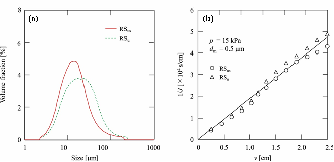 圖8 RSus和RSu的特性。(a)粒度分布;(b)過(guò)濾行為(橫軸v表示單位面積上濾過(guò)的濾液體積,縱軸1/J表示過(guò)濾速率的倒數(shù))(來(lái)自原文)