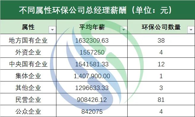 “固廢>水務(wù)”這一趨勢和過去兩年的環(huán)保上市公司業(yè)績趨勢一致。中國水網(wǎng)2020年與2021年的環(huán)保上市公司年報數(shù)據(jù)統(tǒng)計結(jié)果顯示,連續(xù)兩年,固廢處置行業(yè)的營業(yè)收入與凈利潤雙雙超過水務(wù)行業(yè)。近兩年隨著《“十四五”城鎮(zhèn)生活垃圾分類和處理設(shè)施發(fā)展規(guī)劃》、《“十四五”循環(huán)經(jīng)濟發(fā)展規(guī)劃》、《“十四五”時期“無廢城市”建設(shè)工作方案》等政策的出臺,帶動了固廢處置行業(yè)中環(huán)衛(wèi)、餐廚垃圾處理等細(xì)分領(lǐng)域的發(fā)展,從而在一定程度上影響了固廢處置行業(yè)環(huán)保上市公司總經(jīng)理們的年薪水平。不過水務(wù)行業(yè)的環(huán)保企業(yè)也不用太焦慮。進(jìn)入“十四五”時期以來,《關(guān)于推進(jìn)污水資源化利用的指導(dǎo)意見》、《“十四五”城鎮(zhèn)污水處理及資源化利用發(fā)展規(guī)劃》等一系列關(guān)于污水固廢資源化的政策頻繁出臺。在新建水務(wù)項目越來越少的情況下,國家也多次出臺措施助推存量資產(chǎn)盤活,為水務(wù)企業(yè)發(fā)展提供新的思路。此外,從事大氣治理、環(huán)保裝備制造、土壤修復(fù)與環(huán)境監(jiān)測等細(xì)分領(lǐng)域的企業(yè)隨著近年來國家政策的出臺,乘著政策紅利的東風(fēng),其市場規(guī)模也日益突顯,相繼迎來發(fā)展高峰。如,《2021-2030年大氣污染治理行業(yè)發(fā)展展望報告》數(shù)據(jù)顯示,預(yù)計2021-2025年大氣污染治理市場規(guī)模約為1.6-1.8萬億元;在環(huán)保裝備制造領(lǐng)域,工信部、科技部、生態(tài)環(huán)境部三部門于今年1月21日聯(lián)合印發(fā)的《環(huán)保裝備制造業(yè)高質(zhì)量發(fā)展行動計劃》提出,到2025年,環(huán)保裝備制造業(yè)產(chǎn)值要力爭達(dá)到1.3萬億元;再如第三方環(huán)境監(jiān)測運營市場也逐步釋放,2021年上半年共注冊5.0萬家環(huán)境監(jiān)測類企業(yè),同比增長72.4%……種種政策和市場需求創(chuàng)造的紅利為這些細(xì)分領(lǐng)域帶來了積極因素。無論管理層還是普通員工,都是企業(yè)發(fā)展的一個“齒輪”,個人收入的多少都與企業(yè)經(jīng)營狀況掛鉤。環(huán)境產(chǎn)業(yè)各細(xì)分領(lǐng)域市場潛力的釋放與從業(yè)者薪資水平正如月球牽引著潮汐,潮漲潮落,有跡可循。筆者按照wind的分類,將143家環(huán)保公司分為中央國有企業(yè),地方國有企業(yè)、集體企業(yè)、民營企業(yè)、公眾企業(yè)、外資企業(yè)和其他企業(yè)七大類。根據(jù)統(tǒng)計數(shù)據(jù)顯示,地方國有企業(yè)以163.23萬元的總經(jīng)理平均年薪位列第一,外資企業(yè)和中央國有企業(yè)分別位列第二、三位,其總經(jīng)理平均年薪分別為155.73萬元和154.16萬元。前三整體年薪水平差距不大。