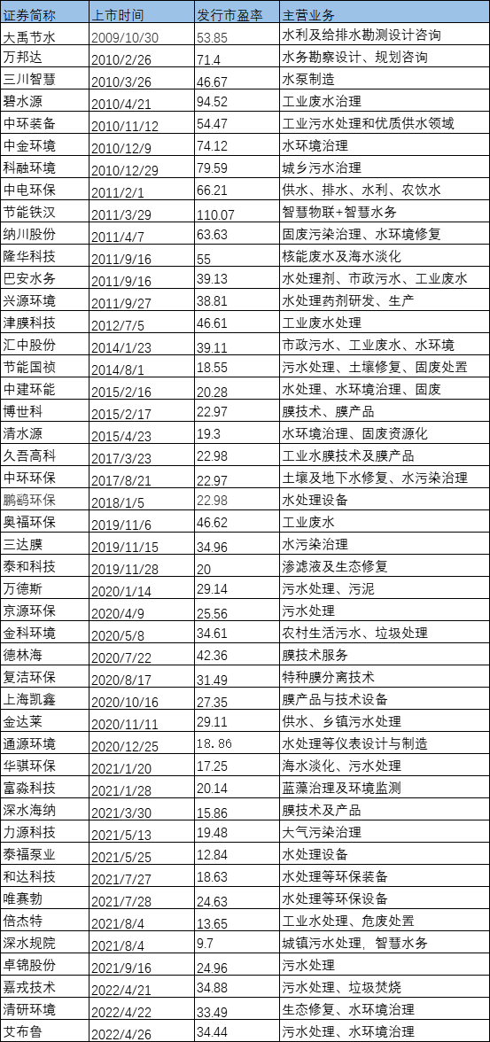 水務(wù)領(lǐng)域48家企業(yè)的平均發(fā)行市盈率則約為36.1,其中2019年之前上市的22家企業(yè)的平均發(fā)行市盈率約為49.24,2019后上市的26家企業(yè)的平均發(fā)行市盈率約為24.9。整體來看,從2009年到至今,水務(wù)企業(yè)的市盈率下降明顯,近乎腰斬,但今年貌似有所回升,新上市的3家企業(yè)的發(fā)行市盈率基本在34左右。