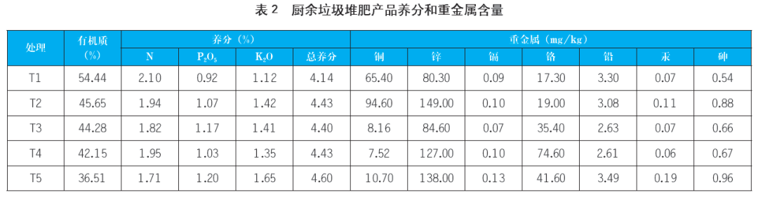 表2為各處理廚余垃圾堆肥產(chǎn)品的有機質(zhì)、養(yǎng)分和重金屬含量。在堆肥過程中,各處理有機質(zhì)含量不斷下降,但均滿足《有機肥料》(NY/T 525-2021)標準(有機質(zhì)含量≥30%)。由于有機物礦化會導致堆體體重減輕發(fā)生濃縮效應(yīng),總養(yǎng)分(以N+P2O5+K2O計)含量增加,各處理含量均>4.0%,具有較高的營養(yǎng)價值。對于各處理重金屬含量,鋅的含量最高(80.30~149.00mg/kg),其次為銅和鉻(7.52~94.60mg/kg和17.30~74.60mg/kg),再者是鉛(2.61~3.49mg/kg),鎘、汞、砷的含量保持在較低范圍(0.070~0.125mg/kg、0.061~0.187mg/kg和0.538~0.964mg/kg),遠低于《有機肥料》(NY/T 525-2021)中重金屬濃度標準。