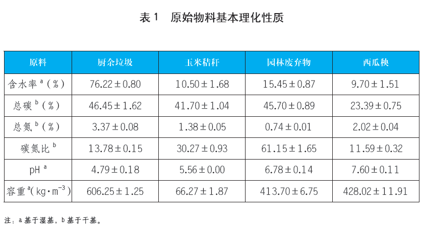 本試驗以分類后廚余垃圾為原料,以粒徑控制在40~50mm以下的玉米秸稈(CS)、園林剪枝(GP)和西瓜秧(WS)按一定比例混合后,作為輔料加入到廚余垃圾中進行堆肥。其中廚余垃圾主要含有60.79%菜葉、8.96%剩飯、19.31%果皮、3.68%蛋殼、1.97%骨頭以及5.29%其他物質(zhì)(以濕重計),主要分布在<30mm粒徑段,其次為>80mm和50~60mm的較大粒徑段,其他粒徑段含量較少。堆肥原料的理化性質(zhì)如表1所示。