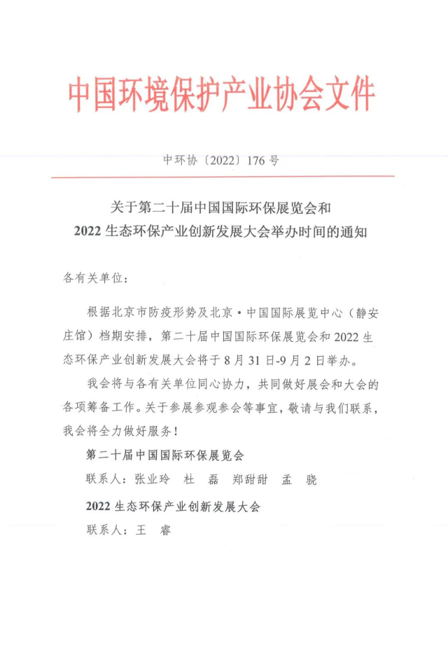 關(guān)于第二十屆中國(guó)國(guó)際環(huán)保展覽會(huì)和2022生態(tài)環(huán)保產(chǎn)業(yè)創(chuàng)新發(fā)展大會(huì)舉辦時(shí)間的通知