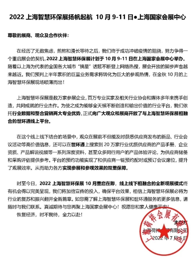 時至今日,2022上海智慧環(huán)保展10月重啟在即,線上線下相融合的全新觀展模式終有機會得以呈現(xiàn),我們將加倍宣傳的投入,確保平臺效果,相信上海智慧環(huán)保展必將為行業(yè)的復蘇和振興翻開全新篇章。如您需了解上海智慧環(huán)保展和世環(huán)通服務的更多信息,請隨時與我們聯(lián)系。真誠期待與您再聚上海國家會展中心!祝愿您和家人健康平安!
