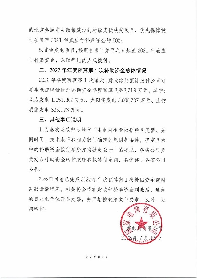 2022年7月15日,國(guó)家電網(wǎng)微信平臺(tái)發(fā)布“關(guān)于2022年年度預(yù)算第1次可再生能源電價(jià)附加補(bǔ)助資金撥付情況的公告”,提到將對(duì)納入補(bǔ)貼或清單且滿足結(jié)算條件的各類項(xiàng)目進(jìn)行及時(shí)、足額轉(zhuǎn)付。