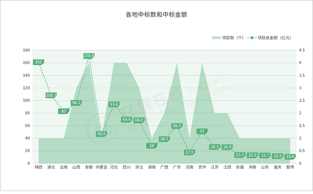 擴展到全部中標項目的熱力分布圖,安徽、河北、四川、廣東、貴州等釋放體量較大,尤其是安徽,數(shù)量多,投資金額也大。陜西雖然只有一個項目,但是其金額達到了161億,單體數(shù)額最高,湖北一個項目也有108.3億。