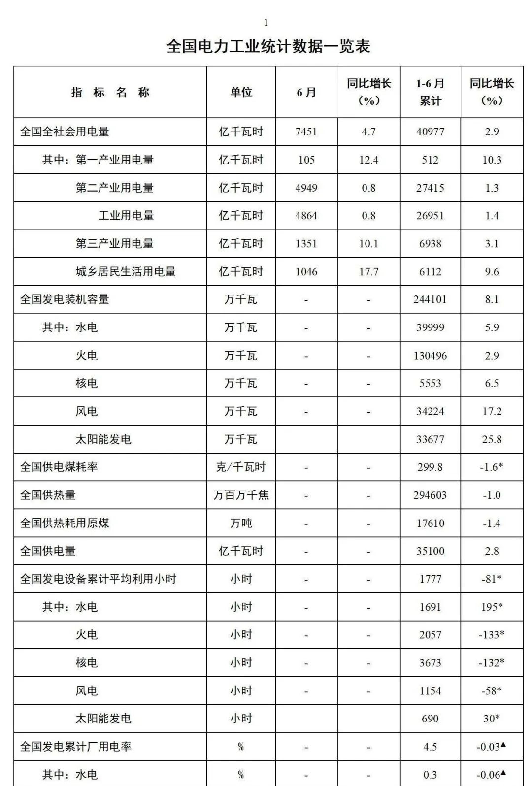 國家能源局發(fā)布1-6月份全國電力工業(yè)統(tǒng)計數(shù)據(jù)