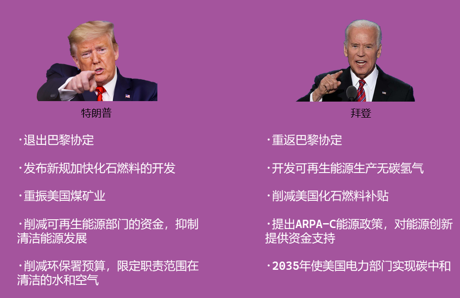 接任總統(tǒng)第一天,拜登便火速提交巴黎協(xié)定“入群申請(qǐng)”,承諾在2050年實(shí)現(xiàn)“碳中和”。同時(shí)宣布一項(xiàng)2萬(wàn)億美元的綠色復(fù)蘇計(jì)劃,促進(jìn)綠氫產(chǎn)業(yè)化,以及“使用聯(lián)邦政府的采購(gòu)系統(tǒng),實(shí)現(xiàn)百分百能源清潔和車輛零排放”。