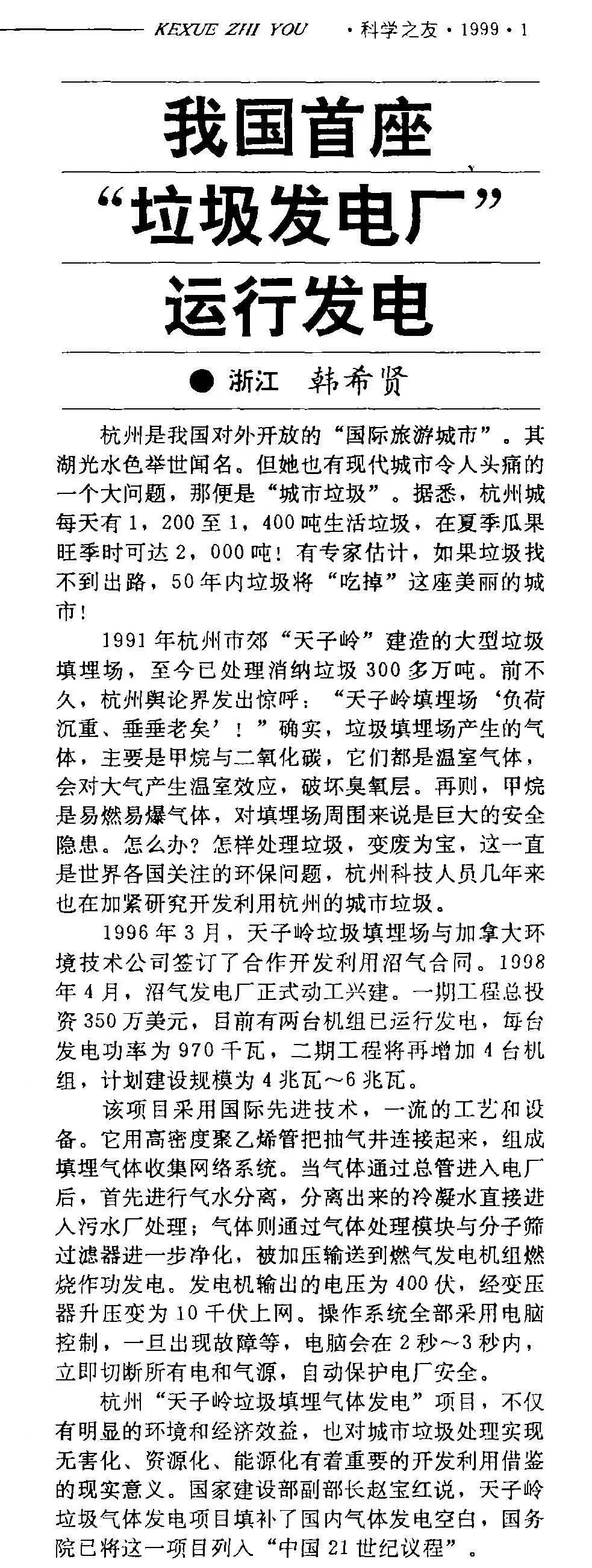 據(jù)當(dāng)時(shí)的媒體報(bào)道,1996年3月,天子嶺垃圾填埋場(chǎng)與一家加拿大公司簽訂了合作開發(fā)利用沼氣合同。1998年4月,沼氣發(fā)電廠正式動(dòng)工興建。一期工程總投資350萬美元,安裝兩臺(tái)發(fā)電機(jī)組,每臺(tái)發(fā)電功率為970千瓦,二期工程將再增加4臺(tái)機(jī)組,計(jì)劃建設(shè)規(guī)模為4~6兆瓦。報(bào)道原文表示,杭州“天子嶺垃圾填埋氣體發(fā)電”項(xiàng)目不僅有明顯的環(huán)境和經(jīng)濟(jì)效益,也對(duì)城市垃圾處理實(shí)現(xiàn)無害化、資源化、能源化有著重要的開發(fā)利用借鑒的現(xiàn)實(shí)意義。時(shí)任原建設(shè)部副部長的趙寶紅說,天子嶺垃圾氣體發(fā)電項(xiàng)目填補(bǔ)了國內(nèi)氣體發(fā)電空白,國務(wù)院已將這一項(xiàng)目列入“中國21世紀(jì)議程”。天子嶺垃圾填埋場(chǎng)的設(shè)計(jì)、施工、運(yùn)維及其在滲濾液處理、沼氣發(fā)電等方面的一系列創(chuàng)新,堪稱是中國生活垃圾衛(wèi)生填埋技術(shù)發(fā)展史的一部“縮影”。在1990年代前后,國內(nèi)先后建成了上海老港生活垃圾填埋場(chǎng)、蘇州市七子山生活垃圾填埋場(chǎng)、濟(jì)南市生活垃圾無害化處理廠等一批大型生活垃圾衛(wèi)生填埋設(shè)施,導(dǎo)引著中國生活垃圾處理進(jìn)入“衛(wèi)生填埋”新時(shí)代。而在那之前,我們的生活垃圾還只能簡單堆放、簡易填埋,甚至直接傾倒入河流、海洋。可以說,生活垃圾“衛(wèi)生填埋”是國內(nèi)首個(gè)徹底改變?nèi)珖罾幚憩F(xiàn)狀的新技術(shù),地位絕不啻于后來風(fēng)行的垃圾焚燒發(fā)電。從1991年到2020年,包括一埋場(chǎng)和二埋場(chǎng)在內(nèi),整個(gè)天子嶺垃圾填埋場(chǎng)總計(jì)處理生活垃圾近3000萬噸。隨著杭州市生活廢棄物管理轉(zhuǎn)型升級(jí),杭州市生活垃圾處理逐漸形成“焚燒為主、資源化為輔、填埋為保障”的新格局。2020年12月16日23時(shí)58分,隨著最后一張覆蓋膜的密閉完成,天子嶺垃圾填埋場(chǎng)正式結(jié)束填埋主力的角色。