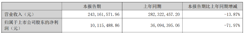 公司上半年度實(shí)現(xiàn)營業(yè)收入24,316.16 萬元,同比下降 13.87%;實(shí)現(xiàn)歸屬于上市公司股東的凈利潤 1,011.55 萬元,同比下降 71.97%。