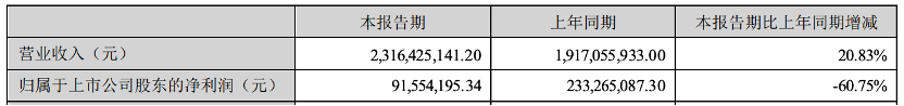 公司上半年?duì)I業(yè)收入為23.16億元,同比增長20.83%;歸屬于掛牌公司股東的凈利潤9155.42萬元,同比下降60.75%。