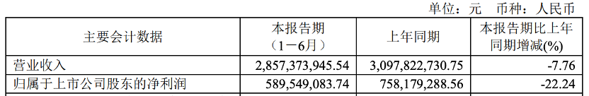 公司上半年?duì)I業(yè)收入為2,857,373,945.54元,同比下降7.76%;歸屬于上市公司股東的凈利潤為589,549,083.74元,同比下降22.24%。