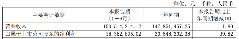 公司上半年?duì)I業(yè)收入為150,514,214.12元,同比增長 1.80%;實(shí)現(xiàn)歸屬于上市公司股東的凈利潤18,382,895.02元,同比下降39.82%。