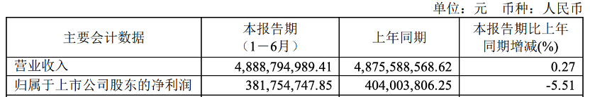 公司上半年?duì)I業(yè)收入為48.89億元,同比增長0.27%;歸屬于上市公司股東的凈利潤3.82億元,同比下降5.51%。