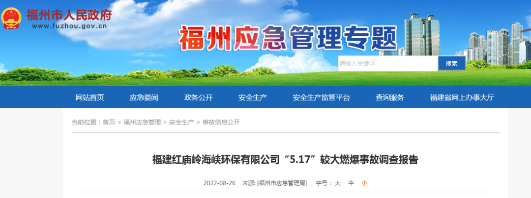 2022年5月17日上午8時54分,福建紅廟嶺海峽環(huán)保有限公司10萬方調(diào)節(jié)池上方外包作業(yè)人員違規(guī)用氬弧焊對除臭設(shè)施風(fēng)管漏點進行焊接施工時發(fā)生燃爆,造成3人死亡,3人受傷,5#、6#池頂蓋坍塌,池頂除臭裝置損壞,直接經(jīng)濟損失約1800萬元。事故發(fā)生后,尹力書記、趙龍省長、郭寧寧常務(wù)副省長、林文斌副省長等領(lǐng)導(dǎo)第一時間做出重要批示,要求全力搜救失聯(lián)人員,全力搶救受傷人員;嚴格救援現(xiàn)場管控,防止發(fā)生次生災(zāi)害;查明原因,舉一反三,排查隱患,防范類似事故發(fā)生;做好善后工作。省委常委、市委林寶金書記、省應(yīng)急廳伍斌廳長、吳賢德市長、省建設(shè)廳王明炫副廳長等領(lǐng)導(dǎo)到場指導(dǎo)應(yīng)急救援。省消防救援總隊高寧宇總隊長、蘇作琴副總隊長率領(lǐng)總隊全勤指揮部到場指揮救援行動。林中麟常務(wù)副市長全時指揮市應(yīng)急局、市消防救援支隊、市城管委、市衛(wèi)健委、市公安局、晉安區(qū)委區(qū)政府及多支民間救援隊進行現(xiàn)場救援。根據(jù)《生產(chǎn)安全事故報告和調(diào)查處理條例》(國務(wù)院令第493號),經(jīng)市政府授權(quán),市應(yīng)急管理局牽頭市城管委、市公安局、市總工會、晉安區(qū)政府成立市政府福建紅廟嶺海峽環(huán)保有限公司“5.17”燃爆較大事故調(diào)查組(以下簡稱事故調(diào)查組),聘請3名專家參與調(diào)查,并邀請市紀委監(jiān)委派員參加。事故調(diào)查組按照“四不放過”和“科學(xué)嚴謹、依法依規(guī)、實事求是、注重實效”的原則,通過現(xiàn)場勘查、技術(shù)鑒定、調(diào)查取證、專家論證、人員問詢、調(diào)閱資料、問題核實和綜合分析,查明了事故發(fā)生的經(jīng)過、原因、應(yīng)急救援、人員傷亡情況和直接經(jīng)濟損失,認定了事故性質(zhì)和責(zé)任,提出了對相關(guān)責(zé)任人員及責(zé)任單位的處理建議及防范整改措施建議。(一)福建紅廟嶺海峽環(huán)保有限公司。成立于2014年02月21日,注冊資本為500萬人民幣,法定代表人為徐國丹,經(jīng)營狀態(tài)為存續(xù),工商注冊號為350100100368616,注冊地址為福州市晉安區(qū)鼓山鎮(zhèn)洋里路16號綜合樓一樓107室,經(jīng)營范圍包括城市污水處理及其再生利用;垃圾滲瀝液收集及處理、環(huán)境污染治理設(shè)施的投資、建設(shè)、運營;城市餐廚垃圾處理;環(huán)境污染治理設(shè)施運營咨詢服務(wù)及技術(shù)服務(wù)(依法須經(jīng)批準的項目,經(jīng)相關(guān)部門批準后方可開展經(jīng)營活動)。為福建海峽環(huán)保集團股份有限公司獨立法人的全資子公司,10萬方新調(diào)節(jié)池項目的實際管理單位。(二)福建致辰宇洋環(huán)??萍加邢薰尽3闪⒂?015年3月12日,注冊資本為1000萬人民幣,法定代表人為俞果,經(jīng)營狀態(tài)為存續(xù),工商注冊號為350100100432860,注冊地址為福州市晉安區(qū)新店鎮(zhèn)秀山路245號索高廣場4#樓1層101單元,經(jīng)營范圍包括一般項目:大氣污染治理;水污染治理;生態(tài)環(huán)境監(jiān)測及檢測儀器儀表銷售;大氣污染監(jiān)測及檢測儀器儀表銷售;海洋水質(zhì)與生態(tài)環(huán)境監(jiān)測儀器設(shè)備銷售;環(huán)境保護監(jiān)測;水質(zhì)污染物監(jiān)測及檢測儀器儀表銷售等(除依法須經(jīng)批準的項目外,憑營業(yè)執(zhí)照依法自主開展經(jīng)營活動)。受福建紅廟嶺海峽環(huán)保有限公司委托對10萬方新調(diào)節(jié)池進行除臭設(shè)施提升。(三)福建省偉邦市政環(huán)保工程設(shè)計研究院有限公司,成立于2006-04-26,注冊資本為300萬人民幣,法定代表人為劉建偉,經(jīng)營狀態(tài)為開業(yè),工商注冊號為350100100173044,注冊地址為福州市鼓樓區(qū)工業(yè)路611號福建高新技術(shù)創(chuàng)業(yè)園主樓4層北6房,經(jīng)營范圍包括市政、環(huán)保工程技術(shù)咨詢、設(shè)計,市政、環(huán)保設(shè)備儀器儀表研發(fā)、推廣、銷售,環(huán)保生物廢水處理劑的研發(fā)、推廣、銷售,市政環(huán)保工程承包建設(shè)。(依法須經(jīng)批準的項目,經(jīng)相關(guān)部門批準后方可開展經(jīng)營活動)。該公司投資入股福建致辰宇洋環(huán)??萍加邢薰境袛埖?0萬方新調(diào)節(jié)池的除臭設(shè)施提升項目;受福建致辰宇洋環(huán)??萍加邢薰镜姆ㄈ舜碛峁校摴竟こ處熽愡B文負責(zé)10萬方新調(diào)節(jié)池的除臭設(shè)施提升項目具體管理。(四)福州嘉鑫華強金屬制品有限公司。成立于2018-06-15,注冊資本為200萬人民幣,法定代表人為羅維嘉,經(jīng)營狀態(tài)為存續(xù),工商注冊號為350121100236032,注冊地址為福建省福州市閩侯縣祥謙鎮(zhèn)林森大道28號,經(jīng)營范圍包括金屬制品、工藝品、建筑材料、家具的加工;家具、文體用品、日用百貨、五金交電的銷售及通過互聯(lián)網(wǎng)銷售。(依法須經(jīng)批準的項目,經(jīng)相關(guān)部門批準后方可開展經(jīng)營活動)。陳連文聯(lián)系該單位為10萬方新調(diào)節(jié)池除臭設(shè)施提升項目制作配套風(fēng)管。(五)福州市紅廟嶺垃圾綜合處理中心,該單位為福州市城市管理委員會直屬事業(yè)單位,主要職責(zé)為承擔(dān)對生活垃圾進行無害化處理和綜合利用工作。設(shè)