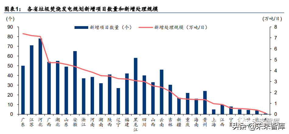2017 年 12 月 12 日,國家發(fā)改委聯(lián)合五部委下發(fā)《關于進一步做好生活垃圾焚燒發(fā)電廠規(guī) 劃選址工作的通知》,要求各省(區(qū)、市)應編制本地區(qū)省級生活垃圾焚燒發(fā)電中長期專項 規(guī)劃。截至 2022 年 5 月底,全國已有 21 個?。▍^(qū)、市)發(fā)布中長期專項規(guī)劃及修訂稿, 13 個省(區(qū)、市)相繼發(fā)布涉及生活垃圾焚燒發(fā)電的“十四五”規(guī)劃,整理后得到 29 個 ?。▍^(qū)、市)規(guī)劃新增項目數(shù)量合計 974 個,新增處理規(guī)模合計 84.3 萬噸/日。其中,規(guī)劃 新增項目數(shù)量前三的?。▍^(qū)、市)為河北、江蘇和安徽,分別為 78/71/65 個,規(guī)劃新增處 理規(guī)模前三的省(區(qū)、市)為廣東、江蘇和河北,分別為 7.4/7.2/7.1 萬噸/日。