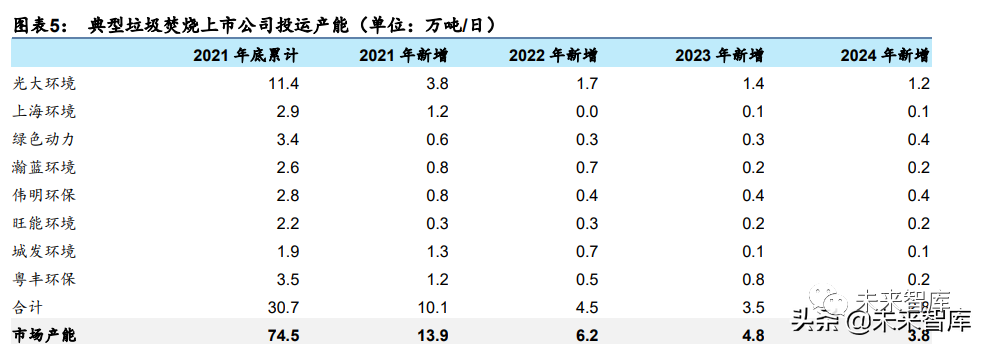 同時,我們選取光大環(huán)境等 8 家典型垃圾焚燒上市公司,根據(jù)我們對投產(chǎn)項目的統(tǒng)計和對 在建項目的投產(chǎn)進度預測,8 家典型公司 2021-2024 年新增投運產(chǎn)能合計 10.1/4.5/3.5/2.8 萬噸/日,2021 年垃圾焚燒市場新增投運產(chǎn)能 13.9 萬噸/日。假設 2022-2024 年市場與典型 公司新增投運產(chǎn)能之比維持 2021 年水平,測算得到 2022-2024 年市場新增投運產(chǎn)能為 6.2/4.8/3.8 萬噸/日,與自上而下測算結果基本一致,從而驗證 2022-2024 年市場新增投運 產(chǎn)能將明顯回落。