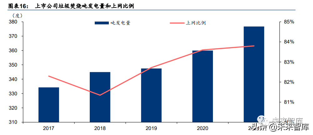 噸發(fā)電量與上網(wǎng)比率的雙重增長帶動噸上網(wǎng)電量顯著提升。將 8 家典型公司的噸發(fā)電量進 行整理和計算,發(fā)現(xiàn) 2017-2021 年噸發(fā)電量由 334 度提升至 377 度,我們認為主要有以下 兩方面原因:1)垃圾分類帶動入爐垃圾熱值水平上升。廚余垃圾含水量高,熱值較低,而 近年來垃圾分類在全國范圍內的推廣,使廚余垃圾與生活垃圾相分離,導致入爐焚燒的廚 余垃圾占比減少;2)爐排爐技術進一步推廣。2016 年全國垃圾焚燒廠中,使用爐排爐技 術的焚燒爐占比為 78%,2020 年占比已經(jīng)提升至 85%以上,相比于流化床技術,爐排爐 技術能使垃圾燃燒的更加充分,從而提升噸發(fā)電量,我們預計 2022-2025 年噸發(fā)電量為 379/381/383/385 度。另外,隨著行業(yè)整體運營水平上升,各企業(yè)致力于生產(chǎn)環(huán)節(jié)節(jié)能降耗, 降低廠用電率,行業(yè)整體上網(wǎng)比率也持續(xù)增長,2018-2021 年間由 81.3%增長至 83.8%, 我們預計 2022-2025 年上網(wǎng)比例逐年提升 0.2 個百分點至 84.6%。以上雙重因素帶動噸上 網(wǎng)電量顯著提升。