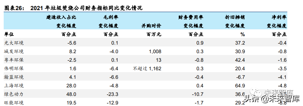 財務費用和折舊攤銷影響下,產(chǎn)能增長有望穩(wěn)定盈利水平。2021 年偉明環(huán)保和城發(fā)環(huán)境均 實施了較大規(guī)模的并購,并購交易對價分別為不超過 11.62/10.08 億元,其財務費用率同比 均有小幅提升,我們認為,并購在短期會帶來財務費用增長,但投運產(chǎn)能的不斷增加將提 供穩(wěn)健現(xiàn)金流,改善公司財務結構,有望消除財務費用增加的短期影響。綠色動力由于首 次確認建造收入和固廢業(yè)務增長,2021 年營業(yè)收入同比+122%,因此財務費用率下降 10.7pp。新增投運產(chǎn)能帶來折舊攤銷上漲,項目投運初期產(chǎn)能利用率較低,盈利能力相對 較低,我們認為,投運項目產(chǎn)能度過爬坡期之后,盈利能力可達到穩(wěn)定狀態(tài)。