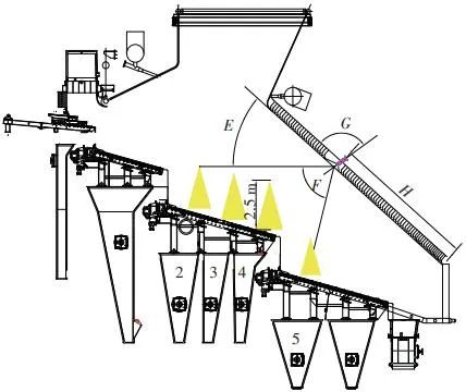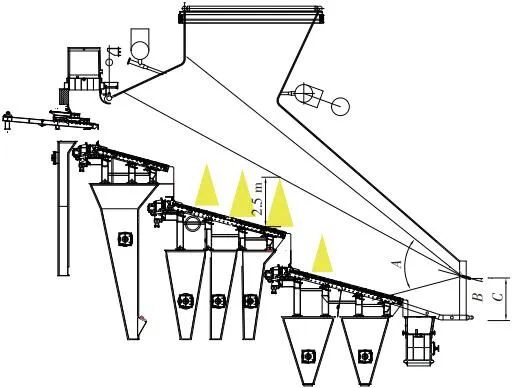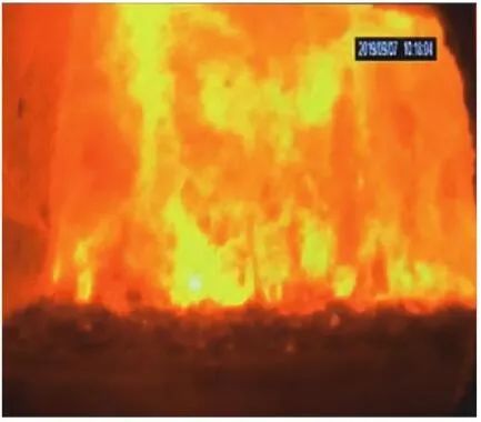 當(dāng)前生活垃圾焚燒爐廣泛采用的爐膛火焰監(jiān)視系統(tǒng)基本上都是由早期應(yīng)用在水泥廠、鋼鐵廠的加熱爐、退火爐和氧化鋁廠等行業(yè)內(nèi)的高溫看火工業(yè)電視演變升級而來。內(nèi)窺式數(shù)字高清爐膛火焰監(jiān)視系統(tǒng)成像裝置主要由耐高溫針孔電動鏡頭、寶石物鏡、光學(xué)濾光片、光圈焦距調(diào)節(jié)器等組成,配有電控推進(jìn)器、氣源控制柜、光端機(jī)等輔助設(shè)備。其核心問題是如何在生活垃圾焚燒爐的高溫、多塵、強腐蝕環(huán)境中長周期穩(wěn)定運行,保證火焰畫面不丟包、不失真。1)優(yōu)勢特性分析。一是技術(shù)成熟、運行穩(wěn)定。隨著我國近一二十年間生活垃圾發(fā)電廠的興建,爐膛火焰監(jiān)視系統(tǒng)的技術(shù)也處于不停地優(yōu)化和迭代之中,目前已能滿足穩(wěn)定、可靠的要求。其中常規(guī)配置參數(shù)為攝像頭300 萬像素,響應(yīng)時間2 s,光圈(F數(shù))1.6,焦距2.4 mm。二是工作環(huán)境好。爐膛火焰監(jiān)視器探頭通常安裝于焚燒爐后墻,所處位置是垃圾燃燒最末端,常規(guī)工況下探頭周圍煙氣溫度通常<600 ℃。較之焚燒爐其他高溫環(huán)境已算“宜居地帶”。三是維護(hù)量小。焚燒爐后墻幾乎沒有結(jié)焦現(xiàn)象,常規(guī)爐膛火焰監(jiān)視探頭開孔位置僅存有因爐膛偶爾正壓時煙氣外冒造成的積灰,積灰量不大,清理工作較為輕松。2)劣勢特性分析。一是參數(shù)單一。因垃圾焚燒行業(yè)爐型構(gòu)造和燃燒成分的特殊性,垃圾焚燒爐長期采用的火焰探頭利用的是光學(xué)成像原理,運行人員僅能通過觀察火焰形狀和位置來判斷焚燒爐工況,無法得到多維度參數(shù)。二是視角局限。爐膛火焰探頭通常位于焚燒爐后墻,安裝角度朝向爐內(nèi)成斜向上方向,與水平線夾角15°左右,探頭視場角通常>60°。以某大型列動順推爐排焚燒爐為例,在此仰視角度下可以看到爐排燃燒段尾部、燃燼段前部兩面明顯的火焰幕墻,由于火焰鋒面遮擋,很難觀察到燃燒段中前部的火焰狀況。 以某單臺750 t/d大型列動順推爐排焚燒爐中爐膛火焰監(jiān)視器安裝位置和顯示畫面為實例,具體分析火焰成像狀態(tài)。其實際火焰成像畫面見圖1。成像角度是由焚燒爐后墻探頭位置向上仰視爐膛。因焚燒工況十分良好,靠近后墻的燃燼段區(qū)域幾乎沒有明火,燃燒段尾部成一面豎直、光亮的黃紅色火焰鋒面,高度約為2.5 m。對應(yīng)的爐膛火焰監(jiān)視器安裝示意如圖2所示。爐膛火焰探頭安裝在焚燒爐后墻,安裝位置與后墻觀火平臺地面距離為C(m)。開孔傾角與水平方向夾角為B(°),有效視場角為A(°)。圖2中由黃色填充的三角形區(qū)域代表正常燃燒火焰,其中標(biāo)注高度2.5 m的區(qū)域為燃燒爐排尾部火焰,即為圖1所顯示的火焰鋒面。顯然,從爐膛火焰監(jiān)視器向上望去,燃燒段前部、中部火焰為視野盲區(qū)。由于被燃燒段尾部火焰鋒面遮擋,通過火焰監(jiān)視器通常只能看到燃燒段尾部、燃燼段前部這兩個區(qū)域的火焰。