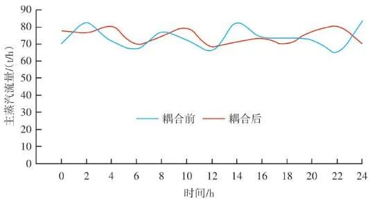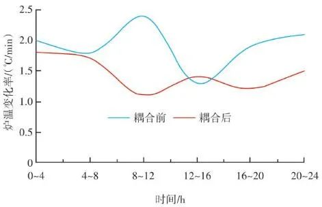 如圖9所示,X區(qū)域?qū)崟r反饋溫度經(jīng)過低切保護(hù)模塊LCUT和濾波模塊LAG后,與預(yù)設(shè)值M進(jìn)行比較,計算的差值進(jìn)入溫度-風(fēng)量折算函數(shù)F(x)。同時根據(jù)溫度上升和下降的速度變化率K,對函數(shù)的輸出速率進(jìn)行擾動,改變其響應(yīng)速度。首先X區(qū)域的理論計算風(fēng)量是耦合前原有ACC系統(tǒng)通過垃圾熱值、垃圾占比、鍋爐蒸發(fā)量、氧氣含量、鍋爐焓值等一系列參數(shù)計算出來的爐排下一次風(fēng)支管風(fēng)量,是實時變化的動態(tài)數(shù)值,而X區(qū)域的溫度預(yù)設(shè)值M與反饋值P的差值反映的是X區(qū)域內(nèi)垃圾焚燒過于劇烈,還是處于未完全燃燒狀態(tài)。因為垃圾焚燒過程的復(fù)雜性,可以做出以下關(guān)系函數(shù):一方面在爐內(nèi)垃圾層厚度等于或大于理論的標(biāo)準(zhǔn)厚度前提下,當(dāng)X區(qū)域溫度M大于P則風(fēng)量減少,當(dāng)X區(qū)域溫度M小于P則風(fēng)量增加,當(dāng)X區(qū)域溫度M等于P則保持原有ACC計算風(fēng)量不變,此時選擇公式F1(x)內(nèi)部函數(shù);另一方面在爐內(nèi)垃圾層厚度小于標(biāo)準(zhǔn)厚度前提下,此時判斷料層過薄,風(fēng)量太大容易出現(xiàn)燒空、燒斷料的情況,因此當(dāng)M與P的差值為正數(shù)或負(fù)數(shù)時都會適當(dāng)減少風(fēng)量,但根據(jù)溫度的高或低對應(yīng)減少風(fēng)量的幅度會不同,此時利用F2(x)內(nèi)部函數(shù)。12個溫度劃分區(qū)域都基于此耦合邏輯,具體設(shè)定參數(shù)適時調(diào)整。通過干擾獨立配風(fēng)的風(fēng)量,達(dá)到改變整個焚燒爐一次風(fēng)風(fēng)量的效果。生活垃圾焚燒爐的排放物在滿足GB 18485—2014 生活垃圾焚燒污染控制標(biāo)準(zhǔn)的前提下,為保障焚燒爐的長期安全運行、汽機(jī)系統(tǒng)的穩(wěn)定高效運轉(zhuǎn),通常通過爐溫和主蒸汽流量這兩個因素來判斷鍋爐運行是否良好。以下工況為某項目單臺750 t/d生活垃圾焚燒爐在紅外熱成像管理系統(tǒng)應(yīng)用前、應(yīng)用后兩段時期的實際運行參數(shù),以此實例來解析該系統(tǒng)的運行效果。該項目額定主蒸汽流量為74 t/h。如圖10所示,藍(lán)色實線為耦合前24 h變化率波動范圍,紅色實線為耦合后24 h變化率波動范圍。爐溫變化率指的是焚燒爐上、中、下3層共計9個溫度測點的熱電偶反饋溫度在每分鐘內(nèi)升高或降低的溫度值,而溫度變化率波動范圍指的是單位時間內(nèi)溫度變化率最高值與最低值之間的溫度差,該差值越大表明爐溫波動越大,即工況越不穩(wěn)定,波動范圍越小表明工況越平穩(wěn)。此期間溫度也一直未低于環(huán)保部要求的最低限(850 ℃/2 s),均介于950~1 050 ℃。焚燒爐主蒸汽流量曲線如圖11所示,左側(cè)縱坐標(biāo)為主蒸汽流量,額定蒸發(fā)量74 t/h。圖中藍(lán)色實線為紅外熱成像系統(tǒng)與ACC系統(tǒng)耦合前24 h的主蒸汽流量曲線,紅色虛線為紅外熱成像系統(tǒng)與ACC系統(tǒng)耦合后24 h的主蒸汽流量曲線。表1中參數(shù)可以計算出耦合前后焚燒爐爐溫波動范圍相對縮減了24.5%,焚燒爐爐溫均值提高了1.2%,蒸發(fā)量波動幅度縮減了3個百分點,主蒸汽流量提高了1.4 t/h。經(jīng)過對主要運行參數(shù)的定量分析,可以看出結(jié)合了紅外熱成像系統(tǒng)的ACC系統(tǒng)在功能性和穩(wěn)定性上有顯著提升。基于目前紅外熱成像管理系統(tǒng)的功能,正在逐步進(jìn)行焚燒爐溫度場重構(gòu)工作,對于紅外探頭收集的大量溫度點實時數(shù)據(jù)進(jìn)行整合并進(jìn)行紅外溫度顯示。傳感器擁有1 440×1 080個像素,其中每個像素都有對應(yīng)的溫度值,該溫度值隨著目標(biāo)溫度的變化在800~1 600 ℃對應(yīng)變化,那么我們就可以將800~1 600 ℃這個范圍內(nèi)的溫度數(shù)據(jù)映射到顏色空間中特定的彩色序列,只要在程序中明確規(guī)定溫度和顏色之間的映射函數(shù)和映射表即可實現(xiàn)相應(yīng)的偽彩顯示,即熱像圖的形式。這樣可為運行人員提供更為直觀、立體的參考依據(jù),待溫度場重構(gòu)系統(tǒng)成熟后,再與ACC系統(tǒng)進(jìn)行結(jié)合,進(jìn)一步提高全廠的自動化程度。紅外熱成像管理系統(tǒng)在生活垃圾焚燒控制領(lǐng)域,與傳統(tǒng)ACC系統(tǒng)經(jīng)過合理的設(shè)計、安裝、邏輯耦合后,對焚燒自動化有以下幾個方面的改變和提升。1)視野擴(kuò)大。改變探頭安裝位置后,成像角度由仰視變?yōu)楦┮暎貙捔藸t內(nèi)火焰視場角度?;鹧娉上裥螤钣伞耙幻婊饓Α?提升為“一片火海”。在具備最基本的“遠(yuǎn)程看火”功能前提下,為運行人員提供更強有力的參考依據(jù)。2)測溫準(zhǔn)確。紅外熱成像原理相比傳統(tǒng)光學(xué)成像原理,增加了溫度反饋功能。利用軟件管理系統(tǒng),將溫度信號解析,并與實際區(qū)域一一對應(yīng)。3)靈活性高。溫度測點的選定可通過管理軟件任意選擇,調(diào)試結(jié)束后仍可根據(jù)實際工況進(jìn)行設(shè)置和改變。4)耦合性強。紅外熱成像管理系統(tǒng)除現(xiàn)有功能外更像是一個平臺,可以對現(xiàn)有溫度參數(shù)和火焰狀態(tài)的大量數(shù)據(jù)進(jìn)行進(jìn)一步提升和利用,例如正在進(jìn)行的溫度場成像功能優(yōu)化和升級工作。5)效益提升。紅外熱成像管理系統(tǒng)融入AC
