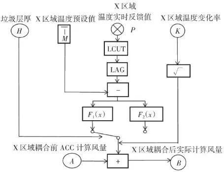 根據(jù)工藝設(shè)計和焚燒爐結(jié)構(gòu),從燃燒段至燃燼段前部為垃圾的燃燒區(qū)域,爐排底部依次有4行風(fēng)室,即圖7中所示2、3、4和5行風(fēng)室,每行各有3列,共計12個風(fēng)室。按照前述的項目實例,圖6中的12個紅外溫度測點,可以得到依次對應(yīng)12個風(fēng)室上部的火焰圖像和燃燒溫度。在傳統(tǒng)ACC系統(tǒng)中,一次風(fēng)的理論供風(fēng)量主要依據(jù)垃圾熱值、垃圾占比、蒸發(fā)量設(shè)定值、鍋爐熱效率等參數(shù)計算得到,在得到理論計算值后,會根據(jù)鍋爐負(fù)荷、垃圾料層厚度、垃圾濕度、燃燒和燃燼段上部溫度等參數(shù)的波動對理論計算值進(jìn)行修正。其中溫度參數(shù)是由安裝在焚燒爐墻兩側(cè)的熱電偶反饋而來,爐溫?zé)犭娕嫉拈L度一般為1.0~1.3 m,除去爐墻壁厚,熱電偶露出爐內(nèi)的長度一般在250 mm左右,熱電偶材質(zhì)為鎳鉻-鎳硅,熱電偶前端耐磨頭長度為250~300 mm,耐磨頭材質(zhì)為鈷60。由于能夠反饋的溫度只能是熱電偶周圍溫度,因此會造成3點限制:①測點數(shù)量有限,若熱電偶數(shù)量增加,鍋爐開孔數(shù)量也要隨之上升,通常燃燒和燃燼區(qū)域安裝熱電偶數(shù)量為4~6支;②耦合性較高,抗干擾能力較低,其中的溫度修正系數(shù)雖然權(quán)重占比不大,但由于熱電偶數(shù)量有限,其單一溫度值對整體其他區(qū)域有連鎖影響,因此局部溫度與局部風(fēng)量無法一一獨立對應(yīng);③準(zhǔn)確性存在衰減,熱電偶的原理是溫度信號轉(zhuǎn)換成熱電動勢信號,通過二次儀表呈現(xiàn)被測介質(zhì)溫度。而隨著磨損、腐蝕的加重,其準(zhǔn)確性也逐漸衰減。其中鎳硅合金中的硅和鎳的優(yōu)先氧化是引起鎳鉻-鎳硅熱電偶熱電動勢超差、準(zhǔn)確性降低的主要原因。根據(jù)上述內(nèi)容,我們在得到理論計算風(fēng)量之后,針對每一段風(fēng)室進(jìn)行獨立的風(fēng)量修正。圖9中:M為對應(yīng)區(qū)域內(nèi)溫度設(shè)定值(℃);H為垃圾層厚度偏差百分比(%);P為對應(yīng)區(qū)域內(nèi)溫度實時反饋值(℃);K為對應(yīng)區(qū)域內(nèi)溫度變化率(℃/min);√ ̄為速度變化率高低限范圍(℃/min);LCUT為低切保護(hù)模塊(℃);LAG為高階濾波模塊(℃);A為理論計算風(fēng)量(m3/h);B為實際輸出計算風(fēng)量(m3/h)。