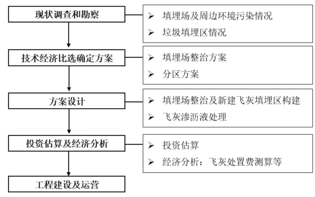根據(jù)住房城鄉(xiāng)建設(shè)部發(fā)布的《2022年中國城市建設(shè)狀況公報(bào)》,截至2022年底,全國城市生活垃圾焚燒處理能力已達(dá) 80.46萬噸/日,占比為72.53%。我國生活垃圾焚燒爐型主要為機(jī)械爐排爐和循環(huán)流化床,其中機(jī)械爐排爐飛灰產(chǎn)率一般為2%~5%,循環(huán)流化床飛灰產(chǎn)率一般為8%~15%。飛灰產(chǎn)率按3%~5%計(jì)算,則年產(chǎn)飛灰量約為881萬~1468萬噸。由于含有較高浸出濃度的重金屬和高毒性當(dāng)量的二噁英等有毒有害物質(zhì),生活垃圾焚燒飛灰被列入《國家危險(xiǎn)廢物名錄》。根據(jù)《2022年生態(tài)環(huán)境公報(bào)》,2022年工業(yè)危險(xiǎn)廢物產(chǎn)生量為9514.8萬噸,飛灰占比約為9.2%~15.4%,飛灰產(chǎn)量較大。飛灰的妥善處置關(guān)系到生活垃圾焚燒廠的穩(wěn)定運(yùn)行,也是生活垃圾焚燒行業(yè)的難題和短板。目前,飛灰處置方式包括進(jìn)入危險(xiǎn)廢物填埋場填埋處置、固化/穩(wěn)定化處理后進(jìn)入生活垃圾填埋場填埋處置、水洗預(yù)處理后水泥窯協(xié)同處置、高溫熔融/玻璃化、高溫?zé)Y(jié)等,其中,固化/穩(wěn)定化處理后進(jìn)入生活垃圾填埋場填埋處置由于技術(shù)成熟且成本較低,是當(dāng)前飛灰處置的主流技術(shù)。對于新建填埋場選址困難或飛灰產(chǎn)量較小的地區(qū),對現(xiàn)有生活垃圾填埋場進(jìn)行分區(qū)改造以滿足固化/穩(wěn)定化飛灰填埋要求是較為經(jīng)濟(jì)可行的方式。隨著生活垃圾焚燒發(fā)電廠的建成,現(xiàn)有生活垃圾填埋場將停止接收生活垃圾,若現(xiàn)有生活垃圾填埋場尚有可利用的剩余庫容,對其進(jìn)行分區(qū)改造,既可以充分發(fā)揮其稀缺資源作用,又可以解決生活垃圾焚燒廠的飛灰處置和大修期內(nèi)生活垃圾應(yīng)急處置問題,同時(shí)還可以完善生活垃圾填埋場的現(xiàn)有設(shè)施并治理現(xiàn)存污染,可謂一舉多得。因此,分區(qū)改造項(xiàng)目的建設(shè)十分必要且具有意義。總的來說,項(xiàng)目的建設(shè)具有較好的經(jīng)濟(jì)、環(huán)保和社會(huì)效益,具體體現(xiàn)在:經(jīng)濟(jì)效益:固化/穩(wěn)定化飛灰填埋收益可部分覆蓋現(xiàn)有生活垃圾填埋場治理投資;環(huán)保效益:現(xiàn)有生活垃圾填埋場污染問題得到改善、飛灰得到妥善處置;社會(huì)效益:填埋場原址改造,避免了新選址帶來的占用土地資源、搬遷、新的環(huán)境影響源等問題。如前所述,生活垃圾填埋場分區(qū)改造具有填埋場治理及飛灰入場填埋的雙重屬性,因此,其建設(shè)流程可以參考生活垃圾衛(wèi)生填埋場封場治理、擴(kuò)建,并結(jié)合項(xiàng)目的實(shí)際情況及當(dāng)?shù)叵嚓P(guān)主管部門的要求進(jìn)行,從建設(shè)方案角度,推薦建設(shè)流程如下圖所示: