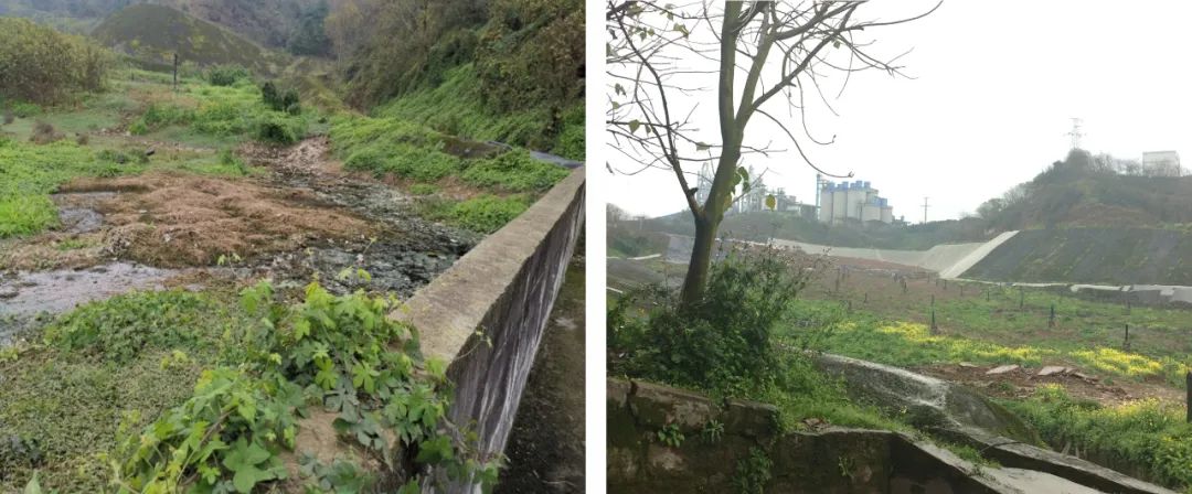 ▲圖1 生活垃圾填埋場分區(qū)改造建設(shè)流程現(xiàn)狀調(diào)查和勘察是首要步驟。現(xiàn)狀調(diào)查和勘察可以厘清填埋場現(xiàn)狀污染和現(xiàn)狀設(shè)施情況,同時(shí)為堆體的穩(wěn)定安全性及改造方案提供依據(jù)。根據(jù)現(xiàn)有垃圾填埋情況,填埋場整治方案分為原位治理和異地處置兩種,異地處置一般適用于已填垃圾量較少的情況,對于垃圾填埋量較大的填埋場,通常選用原位治理方案。分區(qū)方案大致可以分為水平分區(qū)和垂直分區(qū)兩種,顧名思義,水平分區(qū)就是固化/穩(wěn)定化飛灰填埋區(qū)和生活垃圾填埋區(qū)為水平方向上的兩個(gè)獨(dú)立庫區(qū),垂直分區(qū)就是在現(xiàn)有生活垃圾堆體之上構(gòu)建獨(dú)立的固化/穩(wěn)定化飛灰填埋區(qū)。水平分區(qū)適用于原生活垃圾填埋場有未填埋垃圾的區(qū)域或填埋深度較淺通過垃圾清理可以獲得水平向的獨(dú)立庫區(qū),對于垃圾填埋量較大、填埋深度較深的填埋場,采用垂直分區(qū)方案更經(jīng)濟(jì)可行。水平分區(qū)方案建設(shè)內(nèi)容主要包括新建分區(qū)壩、構(gòu)建飛灰獨(dú)立庫區(qū)的雙層防滲系統(tǒng)、飛灰滲瀝液導(dǎo)排及處理系統(tǒng);垂直分區(qū)方案則更為復(fù)雜,在現(xiàn)有生活垃圾堆體之上構(gòu)建垂直的飛灰獨(dú)立庫區(qū),還需要考慮現(xiàn)有生活垃圾堆體沉降、填埋氣導(dǎo)排堵塞、生活垃圾堆體液位高等影響飛灰堆體穩(wěn)定安全的一系列問題,并給出解決方案。飛灰滲瀝液的水質(zhì)特點(diǎn)與生活垃圾滲瀝液完全不同,這與飛灰的形成和螯合固化工藝有關(guān),具體表現(xiàn)為:1)Cl-含量極高;2)Ca2+ 含量較高;3)鉛等重金屬含量偏高;4)COD和NH3-N等指標(biāo)偏低,若煙氣處理或飛灰螯合固化過程中采用滲瀝液處理的濃縮液,則會(huì)導(dǎo)致COD和NH3-N升高。以上特點(diǎn)導(dǎo)致常見的生化技術(shù)和膜分離技術(shù)都無法正常運(yùn)行,而采用簡單的氧化還原處理工藝則難以達(dá)到排放標(biāo)準(zhǔn),故目前飛灰滲瀝液的處理思路通常為:采用晴天作業(yè)雨天不作業(yè)、加強(qiáng)雨污分流覆蓋等方式將飛灰滲瀝液產(chǎn)量控制到最低,若產(chǎn)生少量的飛灰滲瀝液,則輸送至就近的生活垃圾滲瀝液處理站協(xié)同處理。1)工程施工:建議避開雨季,若在雨季施工,盡量減少垃圾裸露面積,以控制臭氣和滲瀝液量;為避免施工裸露或施工碾壓將生活垃圾堆體積存的滲瀝液排出等施工期間滲瀝液大增的情況,建議提前做好預(yù)案。2)運(yùn)營管理:建議做好雨污分流,控制飛灰滲瀝液的產(chǎn)量;若采用垂直分區(qū),建議按規(guī)范要求重點(diǎn)監(jiān)測垃圾堆體沉降、位移等填埋場安全運(yùn)行的相關(guān)指標(biāo)。西南地區(qū)某山谷型生活垃圾填埋場,設(shè)計(jì)庫容約244萬m3,改造時(shí)已填埋生活垃圾約130多萬m3,剩余庫容約110萬m3,垃圾填埋深度在20m左右。通過現(xiàn)狀調(diào)查發(fā)現(xiàn)該填埋場填埋了大量市政污泥、滲瀝液導(dǎo)排系統(tǒng)已堵塞、填埋氣導(dǎo)排系統(tǒng)效果不好、垃圾堆體中滲瀝液液位高、壩前形成了污泥坑,因此,給項(xiàng)目的實(shí)施帶來了嚴(yán)峻的挑戰(zhàn)。改造前現(xiàn)場情況見圖2。