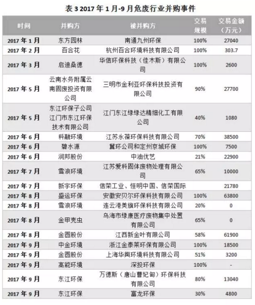 根據(jù)已有公開數(shù)據(jù)的不完全統(tǒng)計(jì),截至2017年9月,2017年危廢行業(yè)發(fā)起并購行為19起起,累積交易金額32.46億元,并購方既包括像東江環(huán)保、啟迪桑德、新宇環(huán)保這樣的“行業(yè)老兵”,也不乏碧水源、盛運(yùn)環(huán)保、中金環(huán)境等“后起之秀”,更有金圓股份等“跨界來者”。