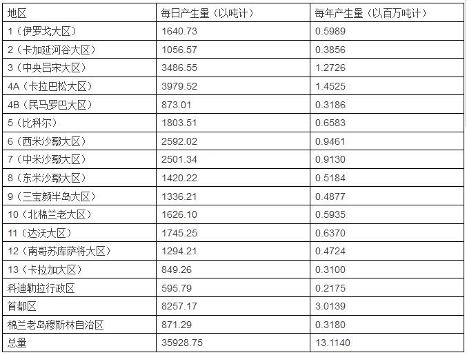 下方的圖表展示的是菲律賓全國各地區(qū)的廢物產(chǎn)生量,數(shù)據(jù)的來源是國家固廢管理委員會秘書處。數(shù)據(jù)是通過計算各地區(qū)人均廢物產(chǎn)生量和人口的乘積得到的。平均來說,在城市區(qū)域和農(nóng)村區(qū)域,人均廢物產(chǎn)生量分別為0.5kg/天和0.3千克/天。在首都區(qū),也就是馬尼拉大都市區(qū)的所在地,人均廢物產(chǎn)生量最高,為0.71千克/人/天。