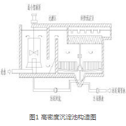 高密度沉淀池由混合區(qū)、絮凝區(qū)、斜管沉淀區(qū)、污泥濃縮區(qū)、中間集水渠及污泥回流系統(tǒng)和剩余污泥排放系統(tǒng)組成?;緲?gòu)造見圖1。