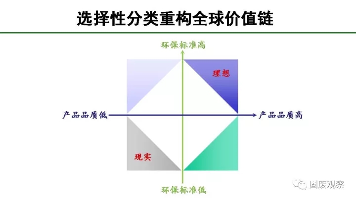 垃圾中的可回收物通常只能降級利用,產(chǎn)業(yè)集聚度和技術(shù)含量低,處于全球價(jià)值鏈的低端。如果我們僅把這些可回收物當(dāng)作資源來考慮,為什么發(fā)達(dá)國家將產(chǎn)業(yè)鏈最低端的可回收物出口到我們國家,這種不公平的全球價(jià)值鏈,我們應(yīng)該重構(gòu)!