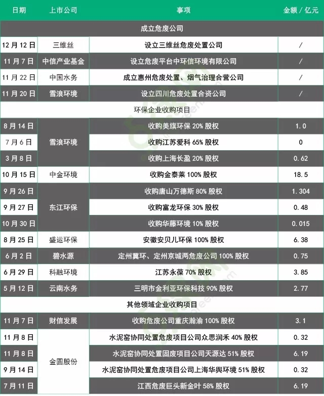 據(jù)不完全統(tǒng)計,環(huán)保企業(yè)共發(fā)生了11起危廢公司的收購事項。其中,雪浪環(huán)境和東江環(huán)保共發(fā)生3起。
