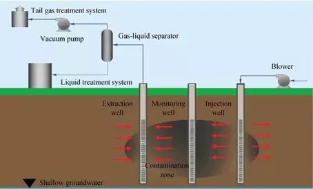 2.氣相抽提法:是去除非飽和區(qū)土壤中揮發(fā)性有機物的有效手段,通過注人井向滲流區(qū)注人空氣,同時利用抽提井產(chǎn)生低壓環(huán)境,使得土壤中存在于油相、溶解相以及吸附相的有機污染物揮發(fā)到氣相中,并經(jīng)抽提井收集到地面尾氣處理裝置中進行回收或處理。