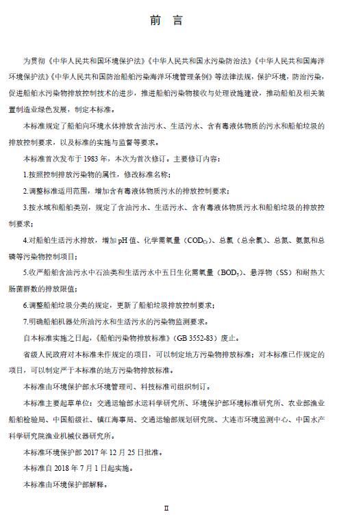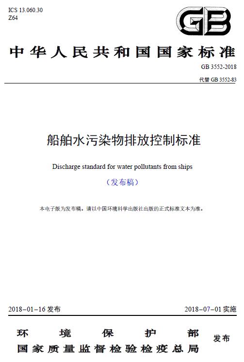 該標準自2018年7月1日起實施,自實施之日起,《船舶污染物排放標準》(GB3552-83)廢止。