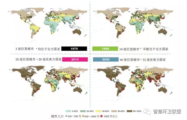 圖5. 1970年~2030年間全球各國人口城市化比例及大城市分布的狀況及預(yù)測