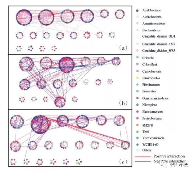 圖9 不種植物(a)和種植大豆(b)與玉米(c)對鎘污染土壤細菌網(wǎng)絡(luò)關(guān)系的影響