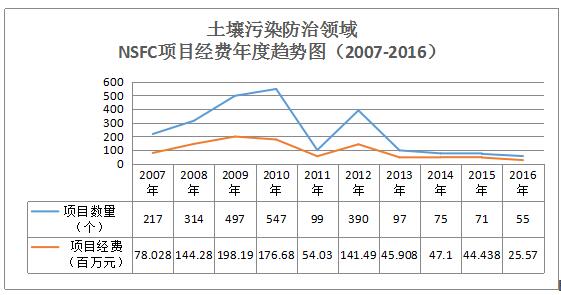 通過統(tǒng)計2007-2016十年內我國國家自然科學基金的項目數據,可知土壤污染防治領域的項目經費在2007-2010年呈穩(wěn)步上升趨勢,2010年申請通過的項目達峰值547個,2011年有所回落,2012年又激增到390個,之后幾年呈現了下降趨勢,2016年僅通過55個項目,經費也隨之下降,如圖9所示。