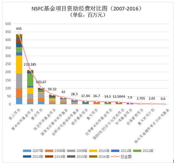 圖10國家自然科學基金項目資助經費對比圖(2007-2016年)