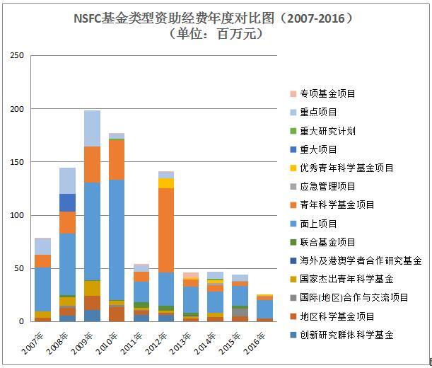 圖11國家自然科學基金基金類型資助經費年度對比圖(2007-2016年)