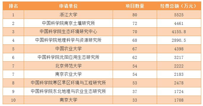 通過項目數據分析(見圖10),土壤污染防治領域在面上項目獲得的經費十年總經費額度排名第一,共計4.35億元,青年科學基金項目排名第二,約為2.13億元。排名第三位的為重點項目,共計1.02億元。面上項目是相對于重點項目而言,由于選題廣泛所以占比比其他類型要高。但是由于2013年起基金委出臺新政策,嚴格把控項目質量。因此導致近幾年資助經費呈下降走勢。