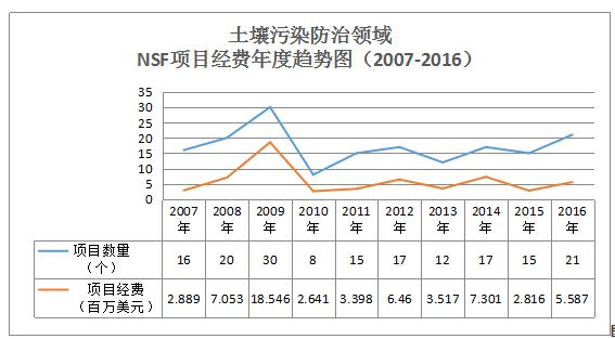 通過項目數據分析(見圖12),在土壤污染防治領域,美國國家科學基金資助經費在2007年至2009年呈現了穩(wěn)步遞增的趨勢,2009年項目數量達到峰值30個。2010年出現拐點,項目數量下降為8個,2011年又開始回升,之后5年一直較為平穩(wěn),2016年有所增加,達到21個。