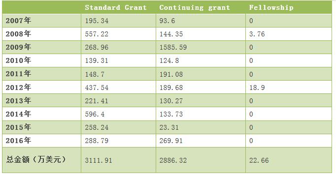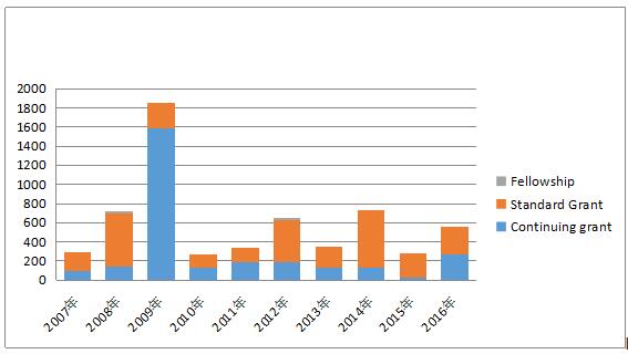 表8美國國家科學基金項目資助類型經費表(2007-2016年)