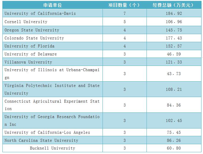 根據統(tǒng)計,本領域申請年份在2007年至2016年間,共有135個機構申請了美國國家科學基金。其中申請數量超過2個的機構有14個獲得經費約為1496.8萬美元,如表9所示。