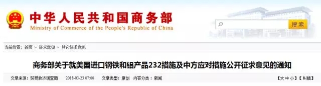 商務(wù)部關(guān)于就美國進口鋼鐵和鋁產(chǎn)品232措施及中方應(yīng)對措施公開征求意見的通知