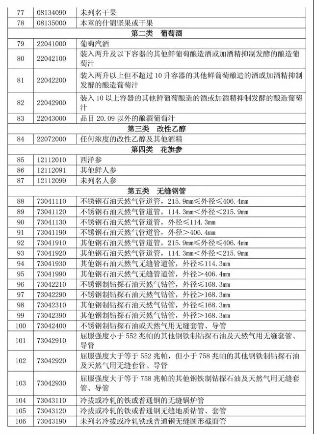 該清單暫定包含7類、128個稅項產(chǎn)品,按2017年統(tǒng)計,涉及美對華約30億美元出口。第一部分共計120個稅項,涉及美對華9.77億美元出口,包括鮮水果、干果及堅果制品、葡萄酒、改性乙醇、花旗參、無縫鋼管等產(chǎn)品,擬加征15%的關(guān)稅。第二部分共計8個稅項,涉及美對華19.92億美元出口,包括豬肉及制品、回收鋁等產(chǎn)品,擬加征25%的關(guān)稅。