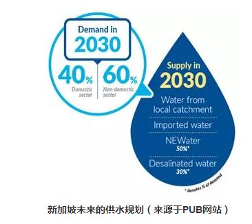 也在同一年,受到NEWater示范項目成功的鼓舞,PUB提出重新制定新加坡的供水水質(zhì)規(guī)劃——“四個國家水龍頭”計劃,計劃到2060年,即與馬拉西亞供水協(xié)議到期前一年,新加坡將完全實現(xiàn)水資源的自給自足,在新加坡的總?cè)丝谝堰_到目前的3倍的前提下,海水淡化和NEWater能夠滿足水資源需求量的80%,其中NEWater占55%。